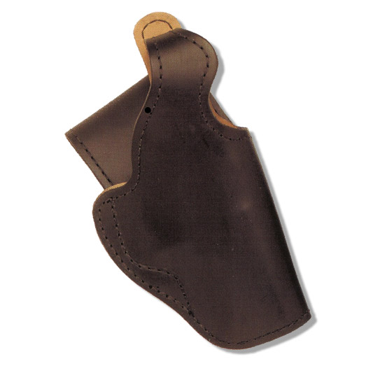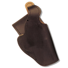 Open top holster, strap style. Molded genuine leather. Manufactured for revolvers and automatics.